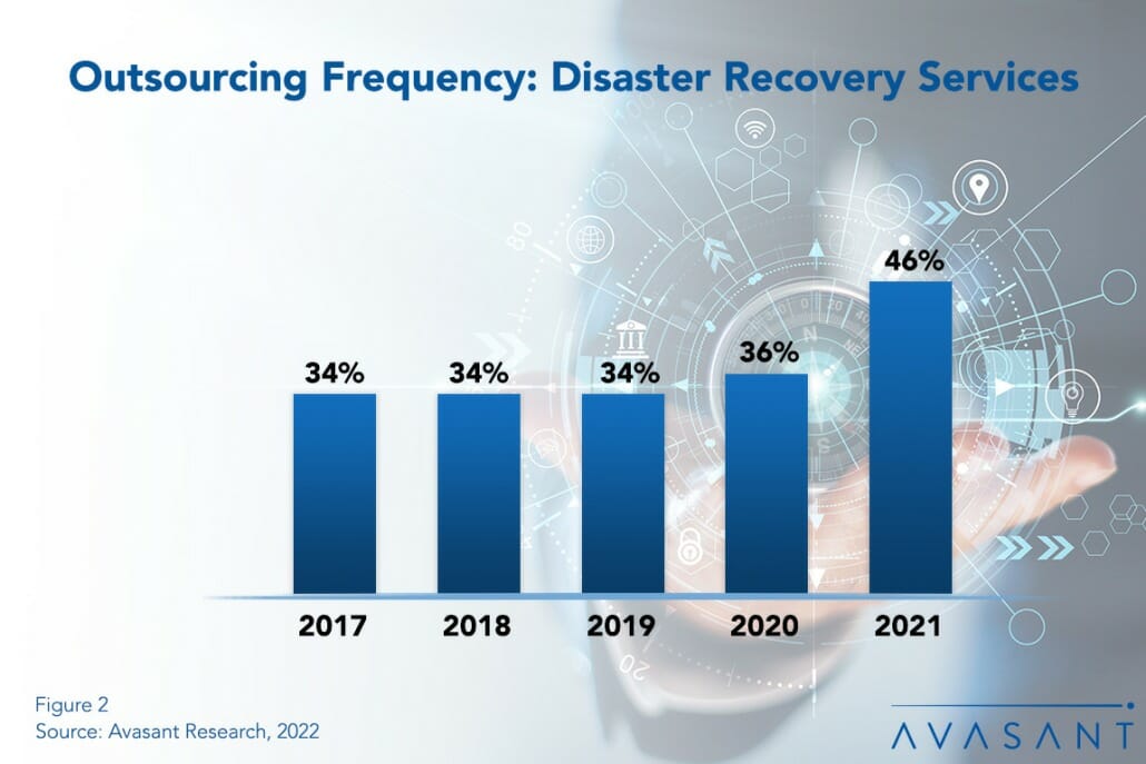 After remaining relatively flat over the past few years, outsourcing of this function significantly increased. As shown in Figure 2 from our full report, Disaster Recovery Outsourcing Trends and Customer Experience, the percentage of organizations outsourcing this function has spiked to 46% in 2021. It appears that the pandemic has shown us that not all disaster recovery scenarios involve major natural events or malicious attacks. With the implementation of hybrid and remote worker models, as well as cloud computing, several organizations have opted to reduce internal workloads to an external service provider with the significant experience, specialized skills, and appropriate facilities to reduce disruption risks.