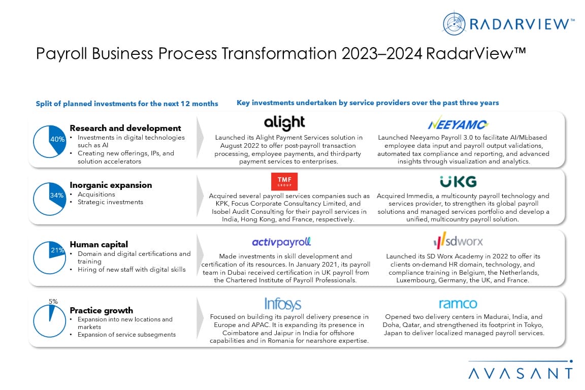 The Payroll Business Process Transformation 2023–2024 RadarView highlights key supply-side trends in this space and Avasant’s viewpoint on them. It aids companies in identifying top service providers to assist them in payroll business process transformation. It also analyzes each service provider’s capabilities in technology and delivery support, enabling organizations to select the right strategic partners for their payroll function.