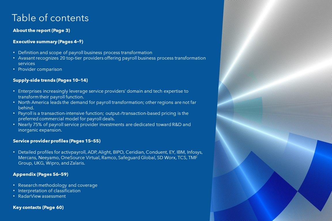 This RadarView includes a detailed analysis of the following payroll business process transformation service providers: activpayroll, ADP, Alight, BIPO, Ceridian, Conduent, EY, IBM, Infosys, Mercans, Neeyamo, OneSource Virtual, Ramco, Safeguard Global, SD Worx, TCS, TMF Group, UKG, Wipro, and Zalaris.