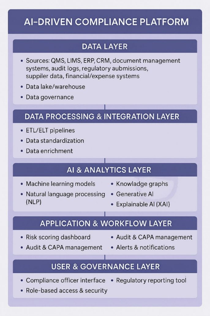 On top of this foundation, AI models operate within a controlled environment that enables scalability and reproducibility. ML algorithms analyze historical compliance and operational data to identify risks and anomalies, while NLP tools process unstructured documents such as SOPs and audit reports. Knowledge graphs offer contextual connections between entities such as products, processes, and suppliers, improving risk interpretation. Generative AI automates preparation of corrective action reports and audit summaries. Explainability modules are incorporated to provide transparent insights into AI decisions for auditing purposes. The platform layers in application interfaces such as dashboards, alerting systems, and workflow tools allow compliance teams to review predictive insights, manage corrective actions, and prepare regulatory submissions. All platform changes go through formal change controls, and environments are continuously monitored for compliance to ensure regulatory requirements are sustained over time.