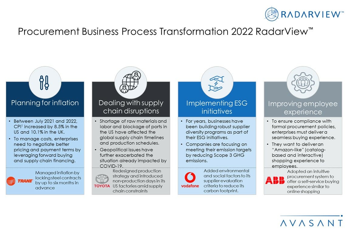 The procurement business function has traditionally been cost-focused; however, with the changing business dynamics, the procurement business function is playing a much more strategic role in enterprise growth and resilience. With the evolution of the procurement function, priorities of chief procurement officers (CPOs) are also evolving. While cost reduction still remains a strategic priority for enterprise CPOs, business leaders also expect CPOs to respond to strategic challenges such as planning for inflation, dealing with supply chain disruptions, building a sustainable supply chain, and improving employee experience. While these priorities are not necessarily new, global challenges are bringing them to the forefront. Due to this, enterprises are increasingly looking to reimagine their procurement function