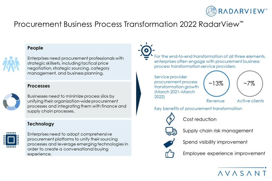 This RadarView helps enterprises to identify key service providers who can enable them to digitally transform their procurement function. It begins with a summary of key trends that are shaping the procurement business process transformation space. We continue with a detailed assessment of 14 providers offering services in the procurement business process transformation market. Each profile provides an overview of the service provider, its key IP assets for procurement transformation, and a list of clients and partners, along with brief client case studies. Each profile concludes with analyst insights on the provider’s practice maturity, domain ecosystem, and investments and innovations.