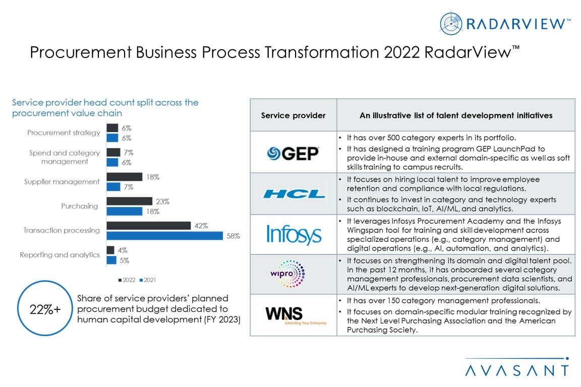 The Procurement Business Process Transformation 2022 RadarView highlights key enterprise and service provider trends in the procurement business process transformation space and Avasant’s viewpoint on them. It aids enterprises in identifying the top service providers and also offers an analysis of each service provider’s technical and delivery capabilities, enabling organizations to identify the right strategic partners for their procurement business process transformation.