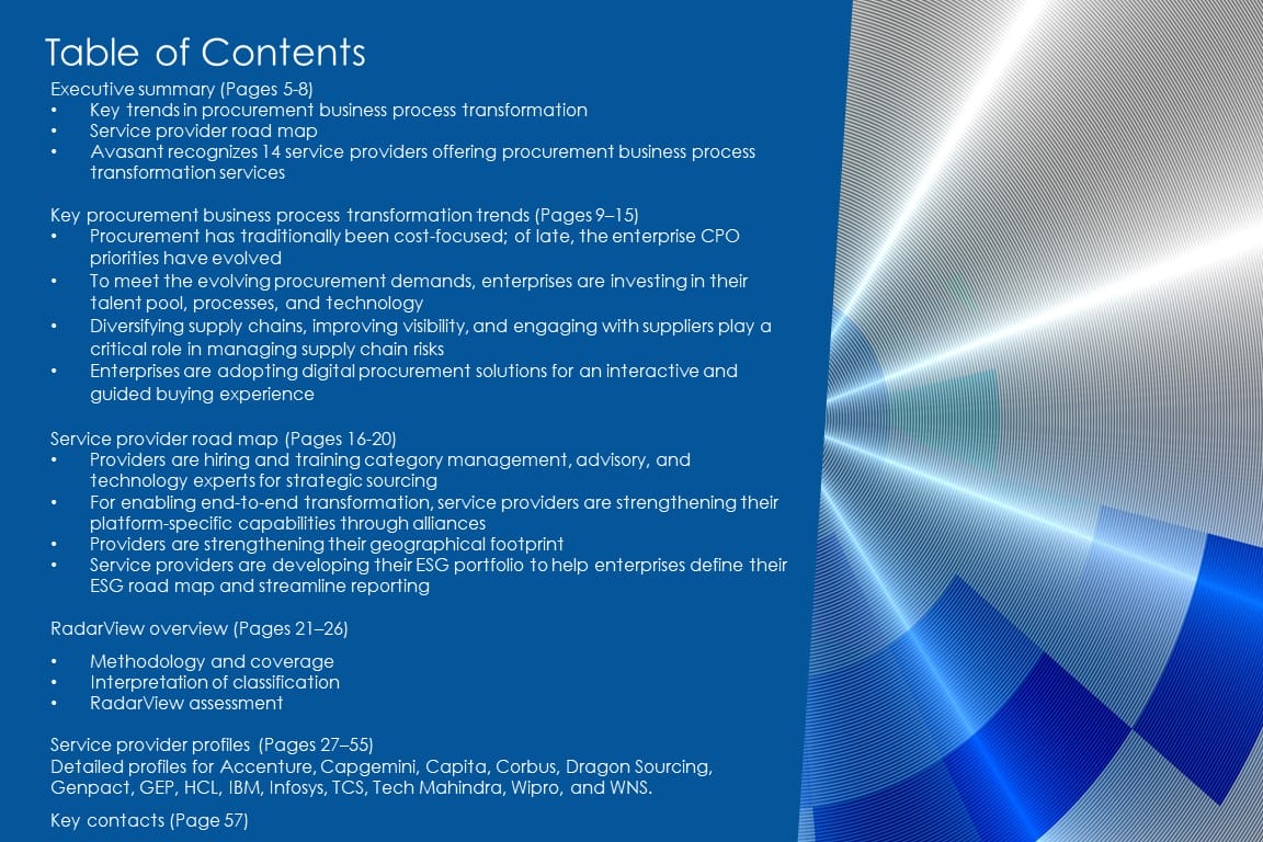 This RadarView includes a detailed analysis of the following procurement service providers: Accenture, Capgemini, Capita, Corbus, Dragon Sourcing, Genpact, GEP, HCL, IBM, Infosys, TCS, Tech Mahindra, Wipro, and WNS.