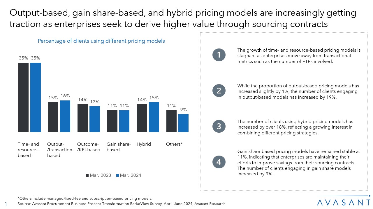 • Output-based, gain share-based, and hybrid pricing models are increasingly getting traction as enterprises seek to derive higher value through sourcing contracts.