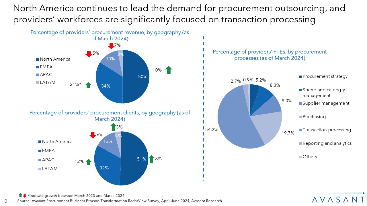 • North America continues to lead the demand for procurement outsourcing, and providers’ workforces are significantly focused on transaction processing.