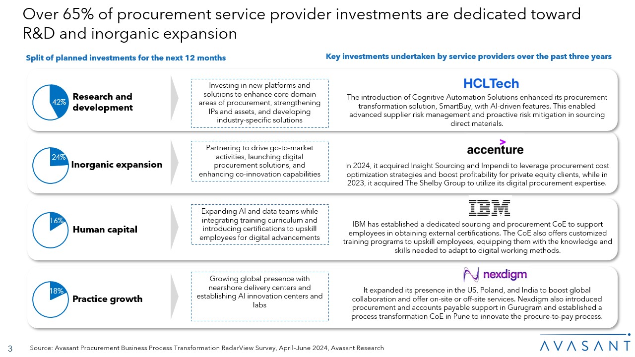• Over 65% of procurement service provider investments are dedicated toward R&D and inorganic expansion.
