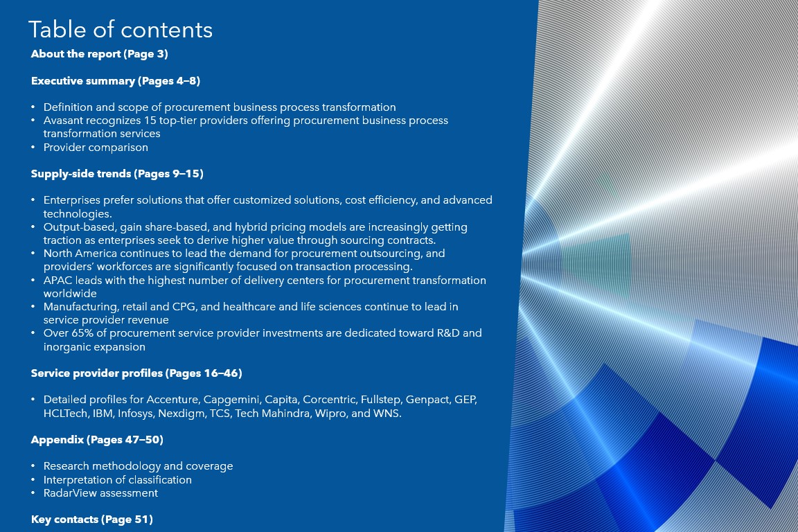 This RadarView™ includes a detailed analysis of the following procurement business process transformation service providers: Accenture, Capgemini, Capita, Corcentric, Fullstep, Genpact, GEP, HCLTech, IBM, Infosys, Nexdigm, TCS, Tech Mahindra, Wipro, and WNS.