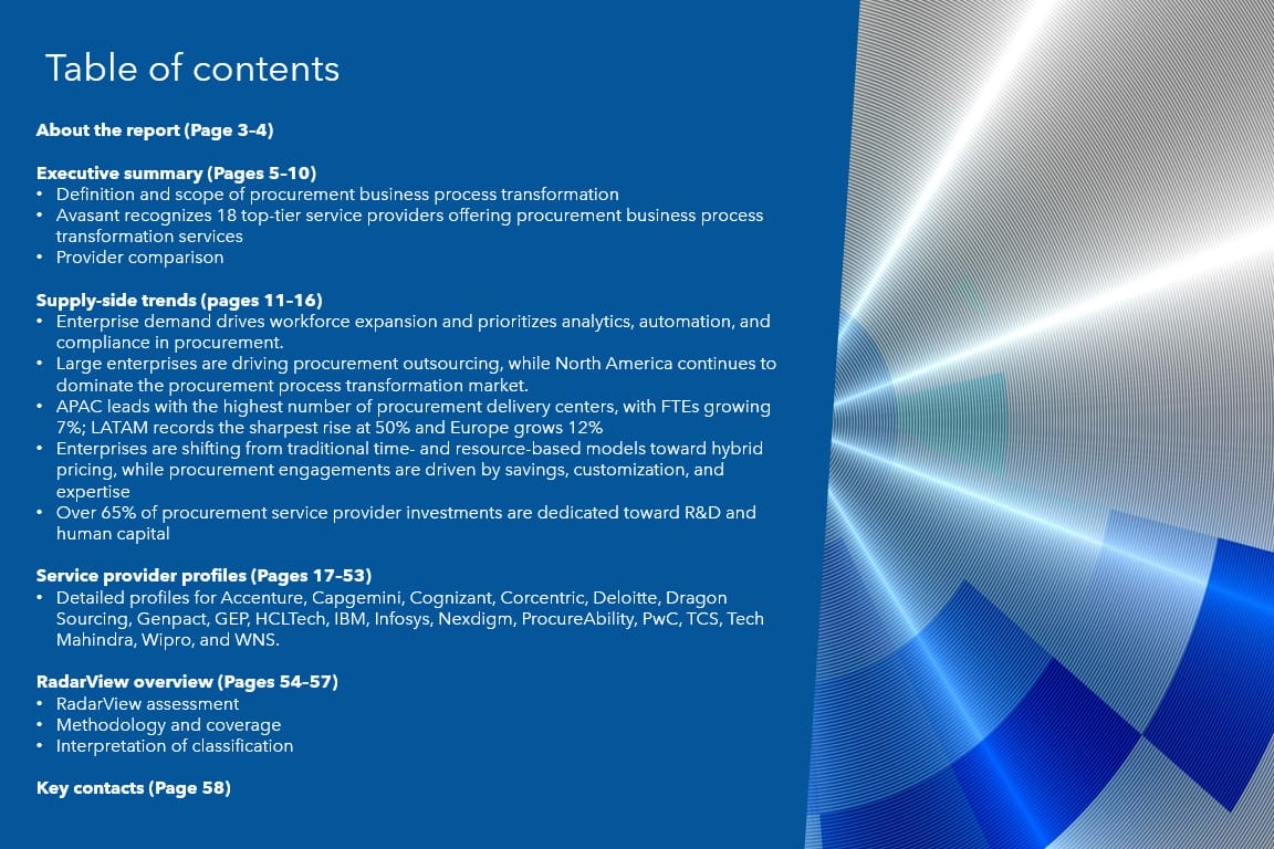 This RadarView includes a detailed analysis of the following service providers offering procurement business process transformation services: Accenture, Capgemini, Cognizant, Corcentric, Deloitte, Dragon Sourcing, Genpact, GEP, HCLTech, IBM, Infosys, Nexdigm, ProcureAbility, PwC, TCS, Tech Mahindra, Wipro, and WNS.