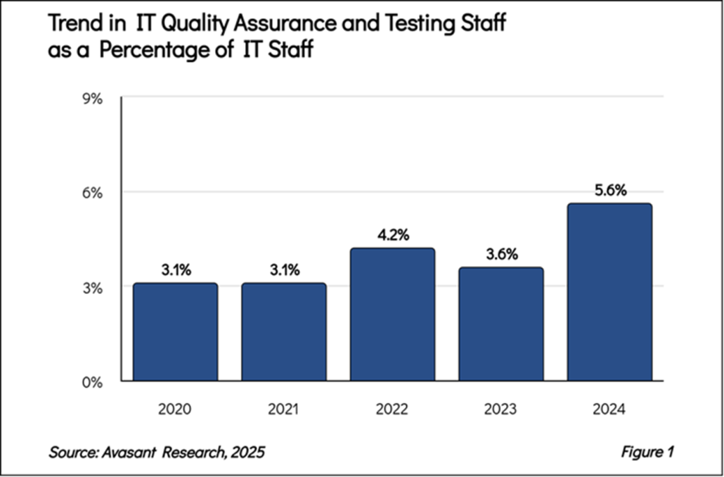 As seen in Figure 1 from our full report, IT Quality Assurance and Testing Staffing Ratios, after a brief fall in 2023, the percentage of QA staff as a percentage of the total IT staff has significantly increased in 2024 from 3.6% to 5.6% at the median level.