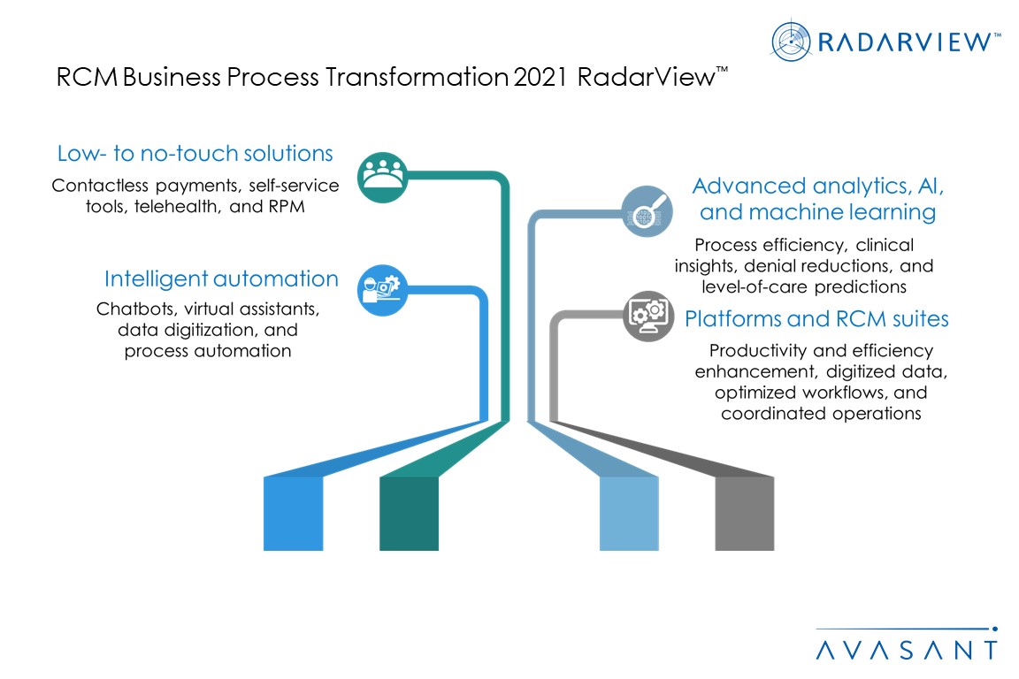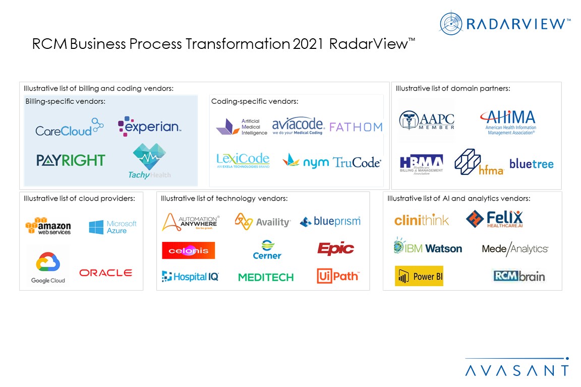 The RCM Business Process Transformation 2021 RadarView highlights the key outsourcing trends in the RCM space and Avasant’s viewpoint on them. It aids companies in identifying top service providers to assist them in transforming their RCM operations. It also offers an analysis of each service providers’ capabilities in technology, domain expertise, and delivery-related support, thus enabling healthcare organizations to identify the right strategic partners for their RCM transformation.
