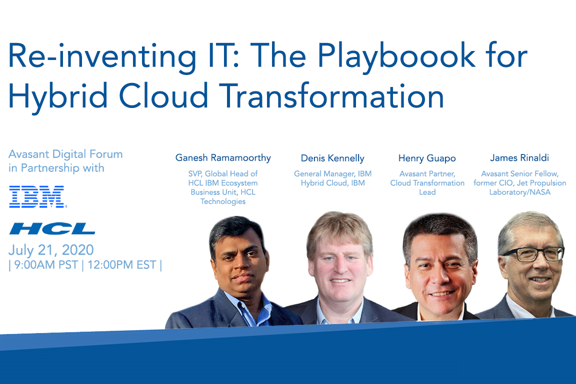 Avasant’s digital forum, “Re-inventing IT: The Playbook for Hybrid Cloud Transformation” addressed the key themes around the future of Hybrid Cloud, how IT can re-invent itself to keep pace with the fast-changing business needs and how executives can accelerate their Cloud journey without exposing their organization to undue risks. Moderated by James Rinaldi, Avasant Senior Fellow and Former CIO, Jet Propulsion Laboratory/NASA, the forum provided tactical insights from the industry’s leading Hybrid Cloud experts Ganesh Ramamoorthy, Senior Vice President and Global Head of HCL IBM Ecosystem Business Unit, HCL Technologies, Dennis Kelly, General Manager, IBM Hybrid Cloud, IBM and Henry Guapo, Partner, Avasant.