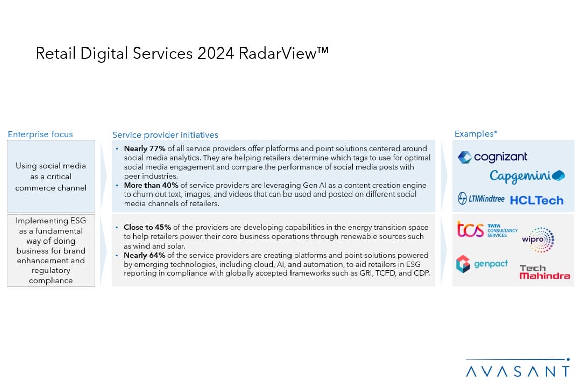 The Retail Digital Services 2024 RadarView™ highlights key supply-side trends in the retail space and Avasant’s viewpoint on them. It aids retail companies in identifying top service providers to assist them in the digital transformation of their services. It also analyzes each service provider’s capabilities in technology and delivery support, enabling organizations to select the right strategic partners for the retail industry.