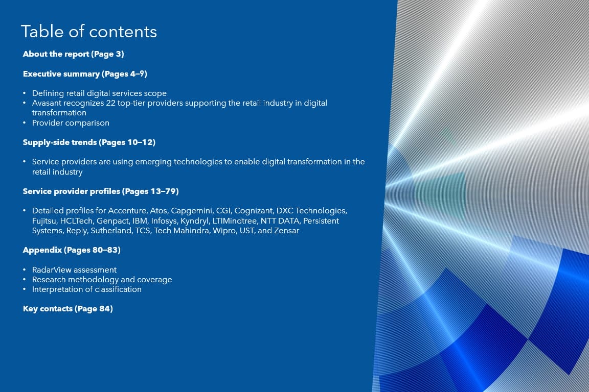 This RadarView helps retail enterprises craft a robust strategy based on industry outlook, best practices, and digital transformation. It begins with a summary of key trends shaping the supply side of the market. It continues with a detailed assessment of 22 providers offering digital services in the retail industry. Each profile gives an overview of the service provider, its industry-specific solutions, and a list of representative clients and partnerships, along with brief client case studies. Each profile concludes with analyst insights on the provider’s practice maturity, investments and innovation, and partner ecosystem.
