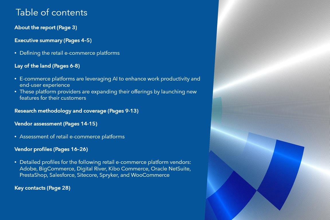 This report identifies 10 vendors offering retail e-commerce platforms. It also provides a comprehensive view of its capabilities.