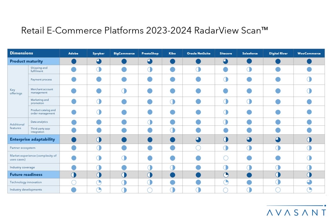 This RadarView Scan includes an analysis of Adobe, Spryker, BigCommerce, PrestaShop, Kibo Commerce, Oracle NetSuite, Sitecore, Salesforce, Digital River, and WooCommerce.