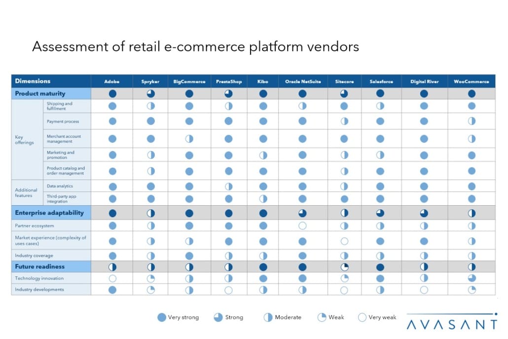 Our evaluation of vendors is based on public disclosures, case studies, product sheets, executive interviews, and our ongoing market interactions. We assess the providers’ retail e-commerce platform implementation capabilities across enterprises, leading to our recognition of the vendors that have brought the most value to the market.