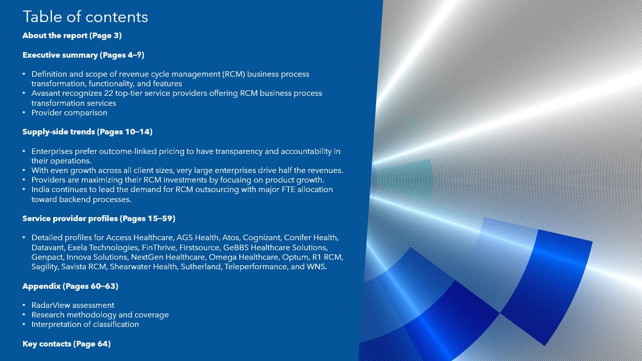 The Revenue Cycle Management (RCM) Business Process Transformation 2024 RadarView™ highlights key supply-side trends in the RCM services space and Avasant’s viewpoint on them. It aids companies in identifying top service providers to assist them in outsourcing RCM services. It also analyzes each service provider’s technology and delivery support capabilities, enabling organizations to identify the right strategic partners for RCM services.