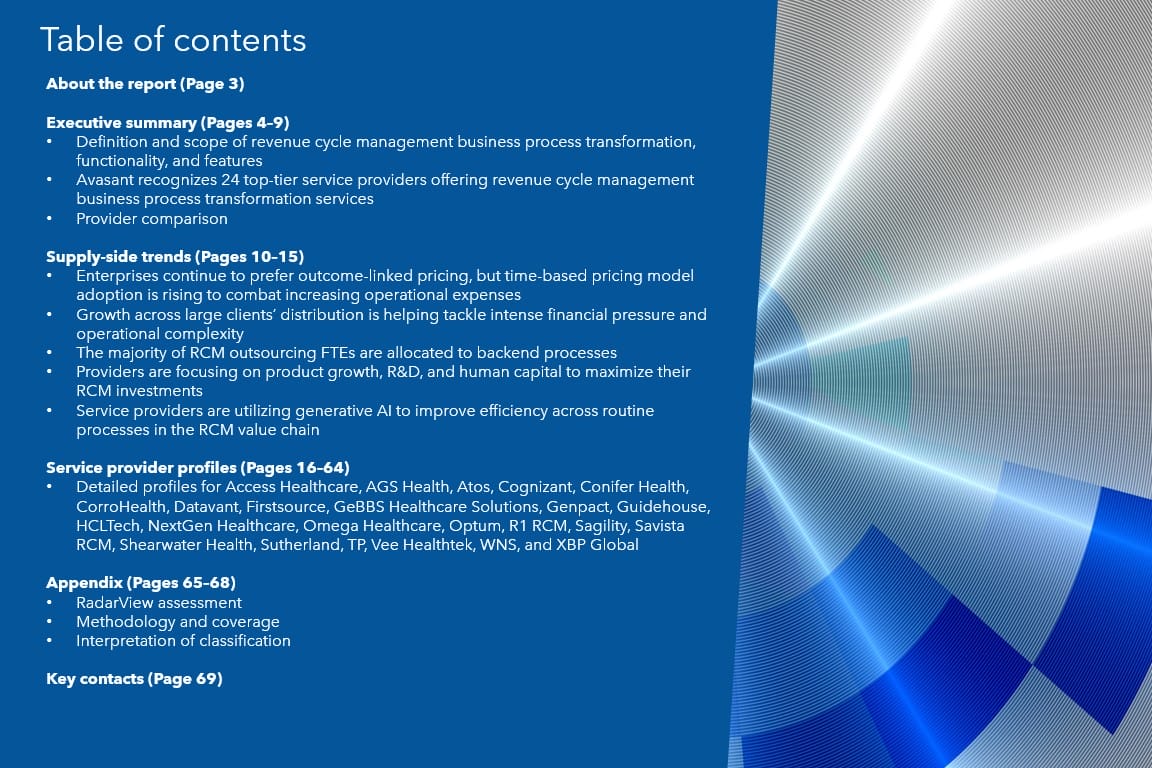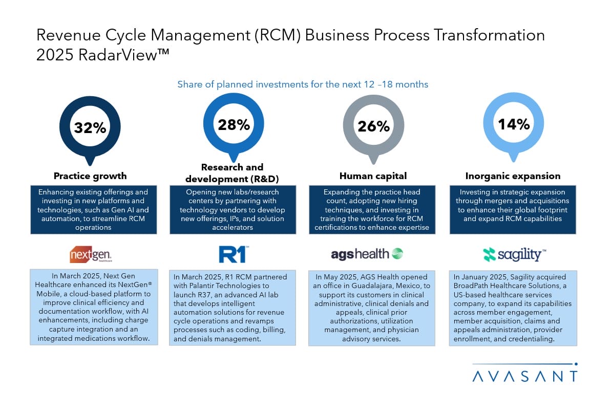 The Revenue Cycle Management (RCM) Business Process Transformation 2025 RadarView™ highlights key supply-side trends in the RCM services space and Avasant’s viewpoint on them. It aids companies in identifying top service providers to assist them in outsourcing RCM services. It also analyzes each service provider’s technology and delivery support capabilities, enabling organizations to identify the right strategic partners for RCM services.