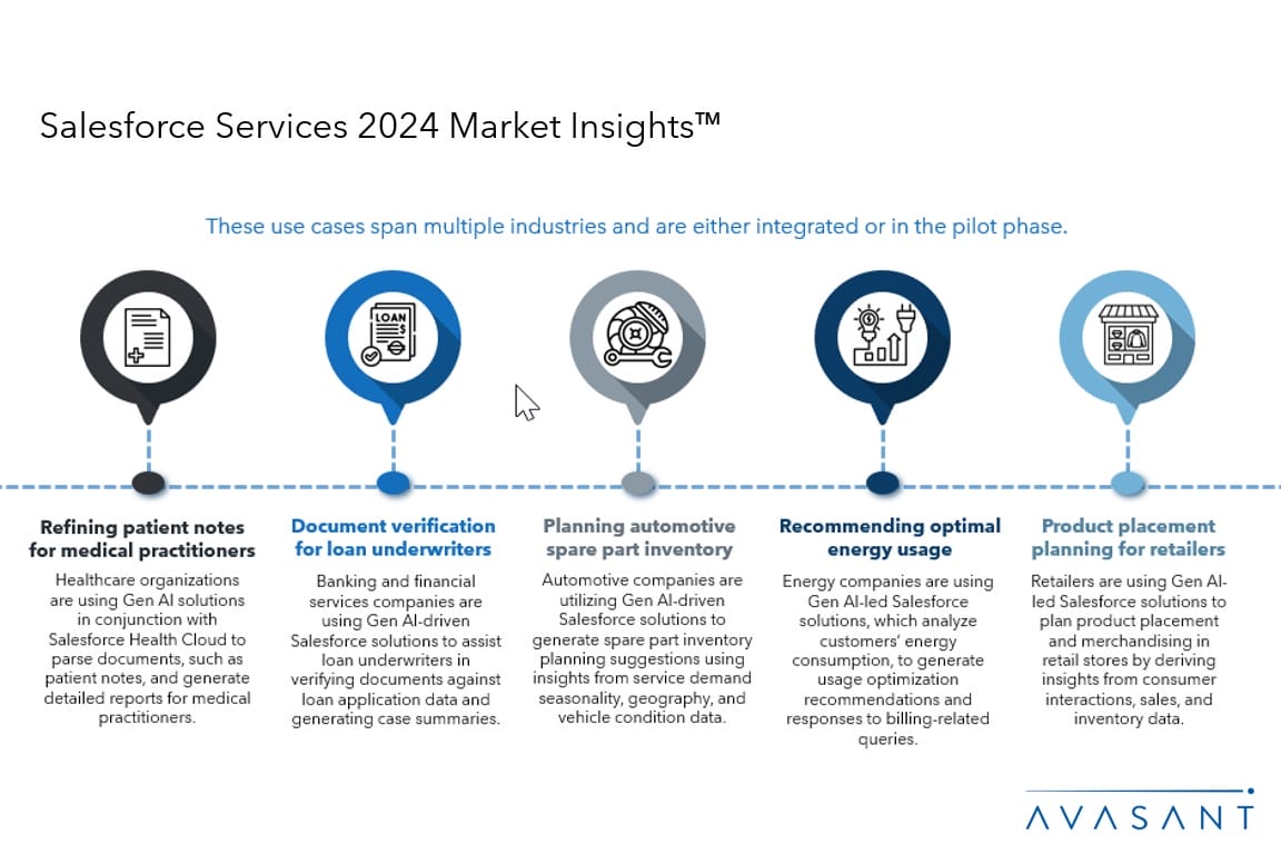 Enterprises are leveraging generative AI-powered Salesforce solutions to drive industry-specific use cases. These solutions are finding traction across industries, including healthcare, banking, automotive, energy, and retail, to facilitate efficient CRM processes. Key use cases addressed include enabling underwriters to assess discrepancies in loan application documents, helping medical professionals refine patient notes, facilitating product placement and merchandising decisions for retailers, resolving billing-related queries for energy consumers, and assisting automotive companies in planning spare part inventory.