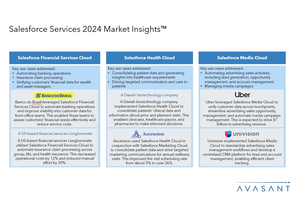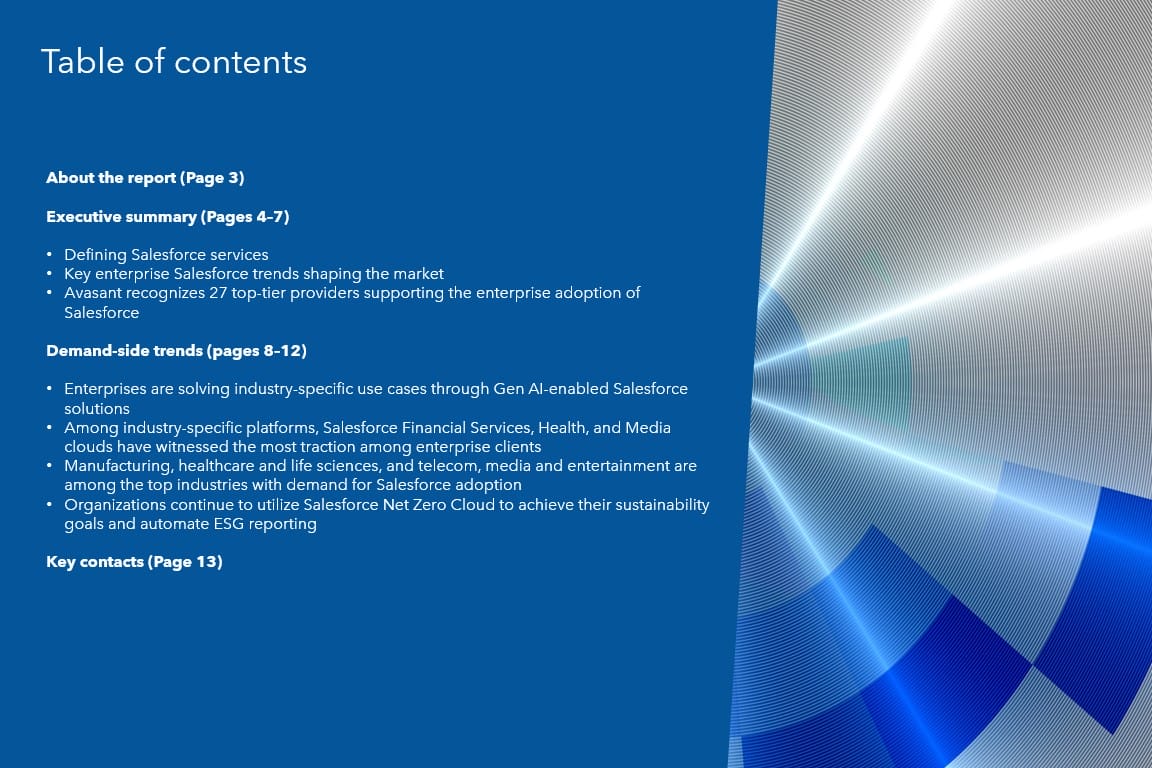 This report identifies key demand-side trends in the Salesforce services space, helping enterprises fine-tune their Salesforce adoption strategies. It highlights the key use cases addressed by enterprises across industries and explores the enterprise adoption of generative AI-driven Salesforce solutions and Salesforce industry platforms.