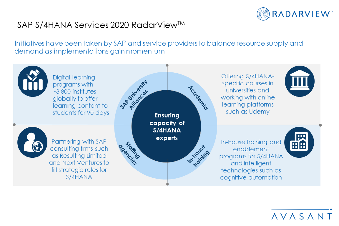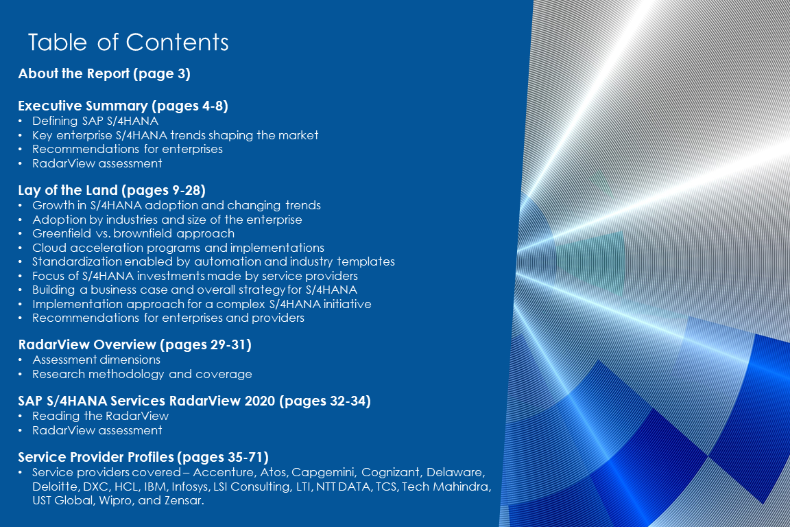 The report covers how the enterprise adoption of SAP S/4HANA services is increasing to gain competitive advantage. It covers the various S/4HANA strategies adopted by enterprises to achieve desired business objectives and lays out the implementation options, approach and the proactive measures to be considered by enterprises who are actively engaged in defining their roadmap for S/4HANA.