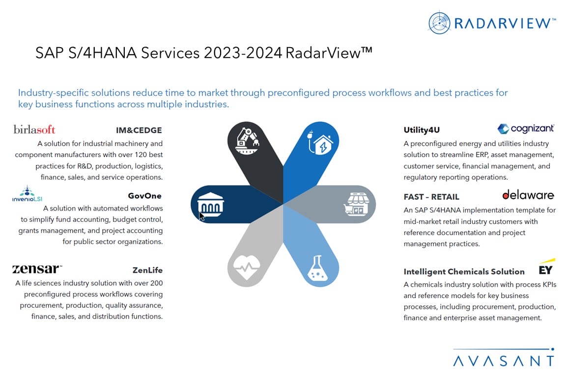 The SAP S/4HANA Services 2023–2024 RadarView™ highlights key supply-side trends in the SAP S/4HANA services space and Avasant’s viewpoint. It aids companies in identifying top service providers to assist them in adopting SAP S/4HANA. It also analyzes each service provider’s capabilities in technology and delivery support, enabling organizations to identify the right strategic partners for adopting SAP S/4HANA.