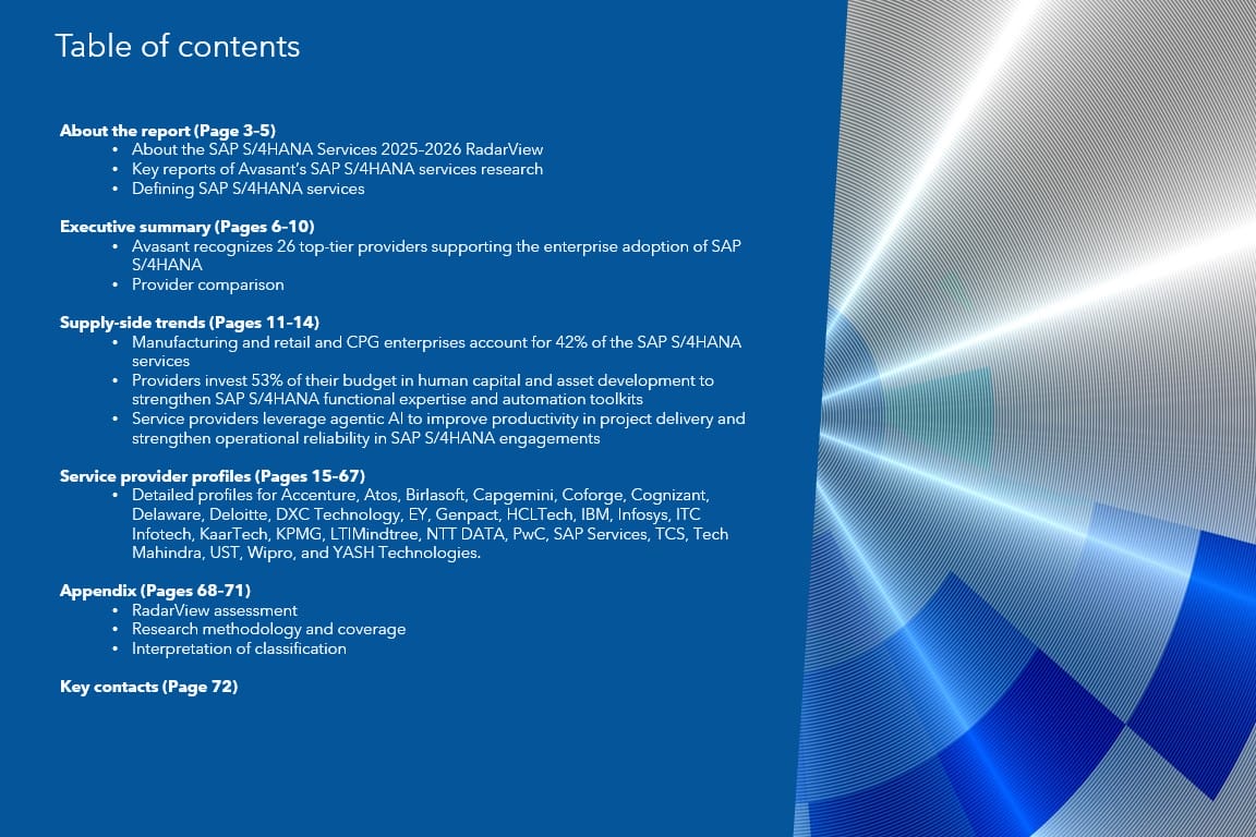 The SAP S/4HANA Services 2025–2026 RadarView™ highlights key supply-side trends in the SAP S/4HANA space and Avasant’s viewpoint. It aids companies in identifying top service providers to assist them in their SAP S/4HANA adoption journey. It also analyzes each service provider’s capabilities in technology and delivery support, enabling organizations to identify the right strategic partners for SAP S/4HANA adoption.