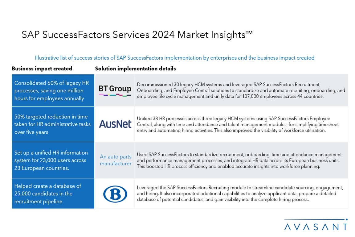 Please refer to Avasant’s SAP SuccessFactors Services 2024 RadarView™ for detailed insights on the service providers and supply-side trends.