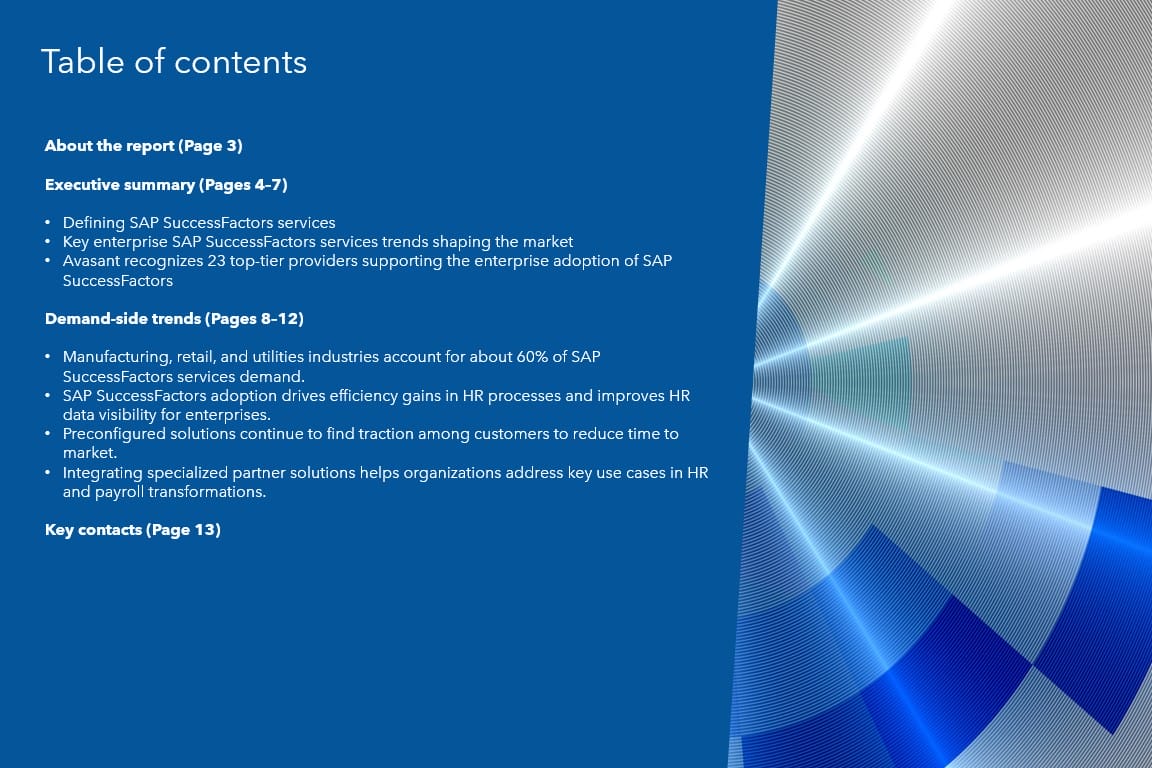 This report identifies key demand-side trends in the SAP SuccessFactors services space, helping enterprises define their strategy for SAP SuccessFactors adoption. It also provides an overview of enterprise challenges in the SAP SuccessFactors services space based on Avasant’s assessment.