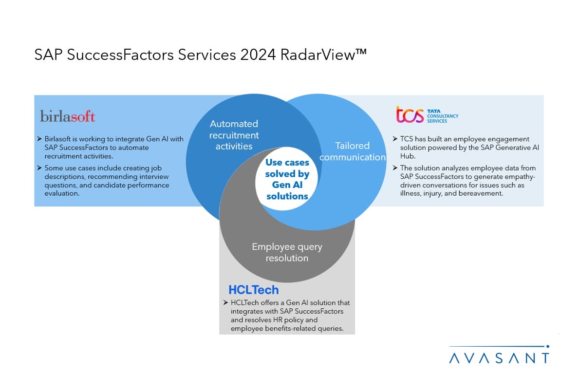 The SAP SuccessFactors Services 2024 RadarView™ highlights key supply-side trends in the SAP SuccessFactors services space and Avasant’s viewpoint. It aids companies in identifying top service providers to assist them in adopting SAP SuccessFactors. It also analyzes each service provider’s capabilities in technology and delivery support, enabling organizations to identify the right strategic partners for adopting SAP SuccessFactors.