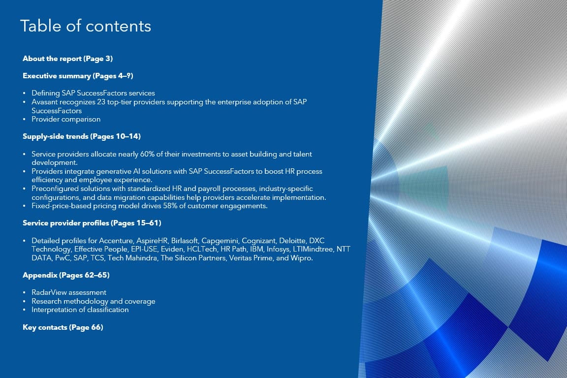 This RadarView includes a detailed analysis of the following SAP SuccessFactors service providers: Accenture, AspireHR, Birlasoft, Capgemini, Cognizant, Deloitte, DXC Technology, Effective People, EPI-USE, Eviden, HCLTech, HR Path, IBM, Infosys, LTIMindtree, NTT DATA, PwC, SAP, TCS, Tech Mahindra, The Silicon Partners, Veritas Prime, and Wipro.