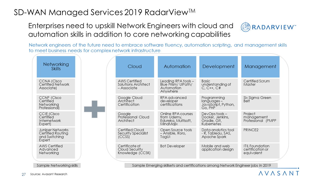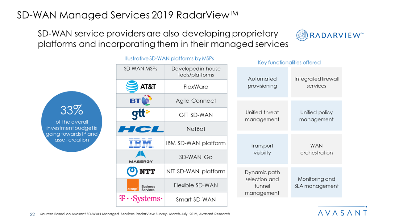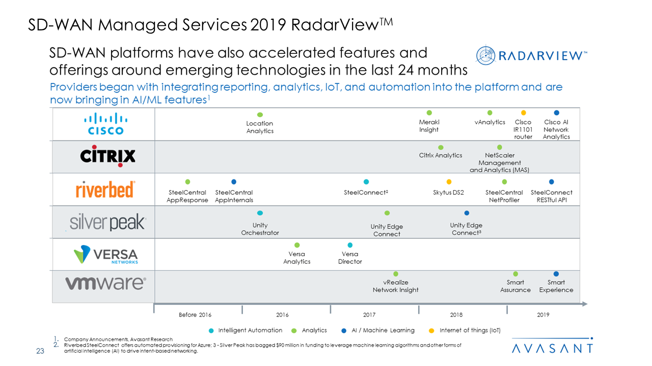 The SD-WAN Managed Services RadarView™ 2019 Report is aimed at providing information about the key trends and best practices to enterprises and build a granular understanding of the SD-WAN ecosystem. This 82 pages report also highlights the key market trends and Avasant’s view on the road ahead for enterprises leveraging SD-WAN Managed Services over the next 12 to 18 months.