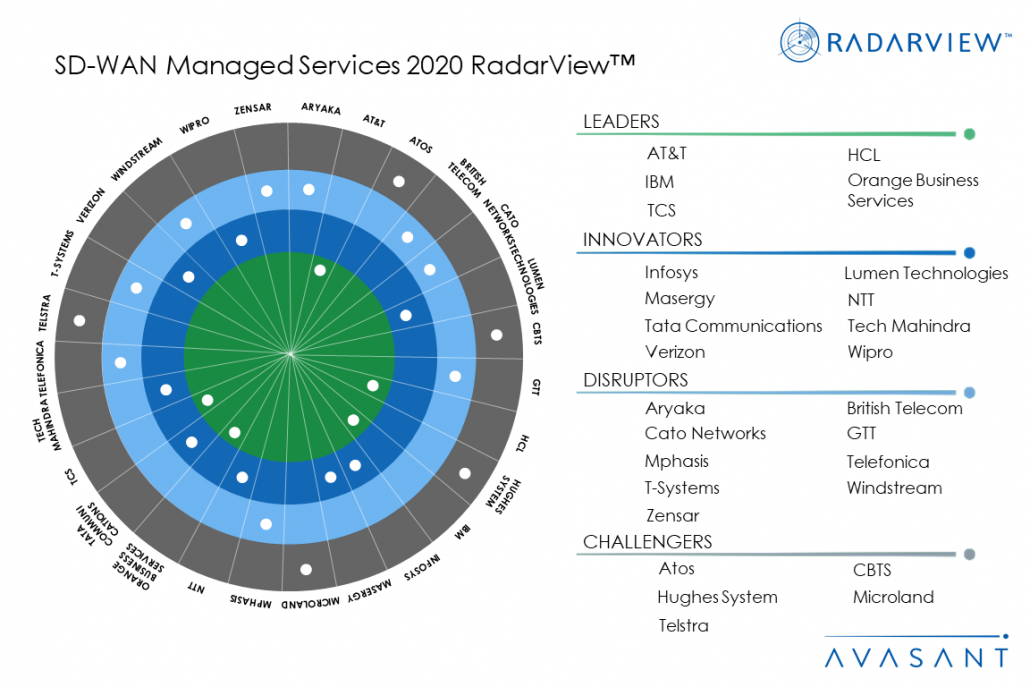 Aryaka, AT&T, Atos, British Telecom, Cato Networks, CBTS, GTT, HCL, Hughes System, IBM, Infosys, Lumen Technologies, Masergy, Microland, Mphasis, NTT, Orange Business Services, Tata Communications, TCS, Tech Mahindra, Telefonica, Telstra, T-Systems, Verizon, Windstream, Wipro, and Zensar.