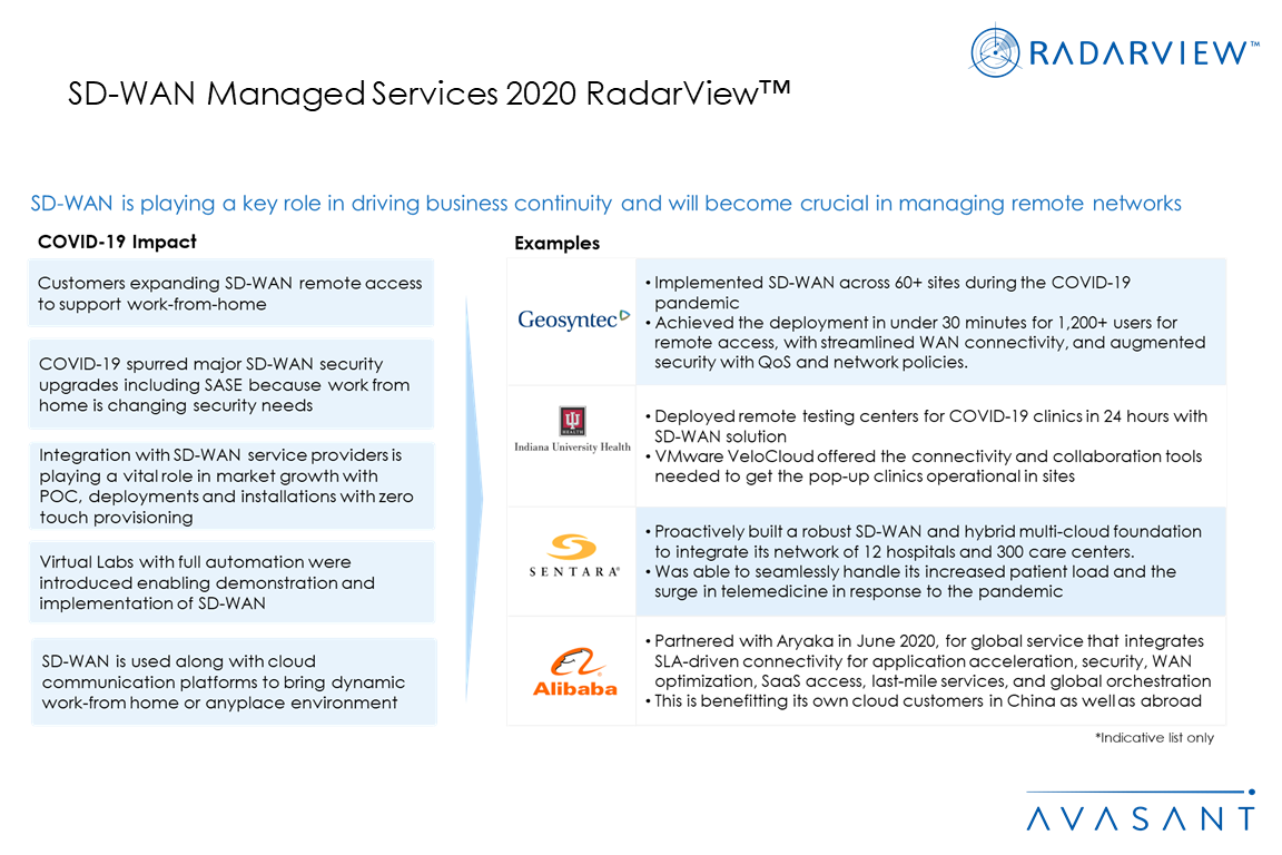 Aryaka, AT&T, Atos, British Telecom, Cato Networks, CBTS, GTT, HCL, Hughes System, IBM, Infosys, Lumen Technologies, Masergy, Microland, Mphasis, NTT, Orange Business Services, Tata Communications, TCS, Tech Mahindra, Telefonica, Telstra, T-Systems, Verizon, Windstream, Wipro, and Zensar.