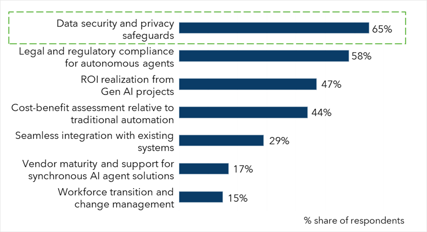 Security continues to be the number one priority for CEOs as organizations navigate increased adoption of AI. According to Avasant’s The Evolution of Synchronous AI Agents: Enterprise Adoption Trends and Strategies, enterprise AI budget allocation increased by 45% between 2024 and 2025, with data security and privacy emerging as the primary decision factors for generative (Gen) AI and agentic AI investments (Figure 1).