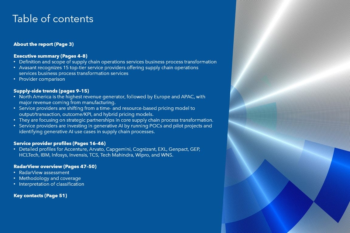 This RadarView™ includes a detailed analysis of the following service providers offering supply chain operations services transformation services: Accenture, Arvato, Capgemini, Cognizant, EXL, Genpact, GEP, HCLTech, IBM, Infosys, Invensis, TCS, Tech Mahindra, Wipro, and WNS.