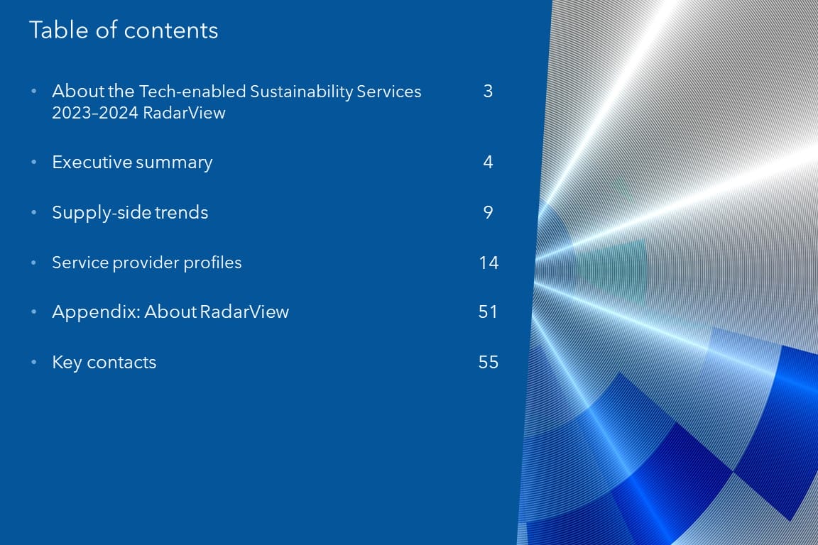 This RadarView helps enterprises integrate ESG into their core business operations using tech-enabled services in their journey toward sustainability. It offers a detailed assessment of 18 tech-enabled sustainability service providers. Each profile gives an overview of the service provider, its products and modules, and a list of clients and partnerships, along with brief client case studies. Each profile concludes with analyst insights on the provider’s practice maturity, partner ecosystem, and investments and innovation.