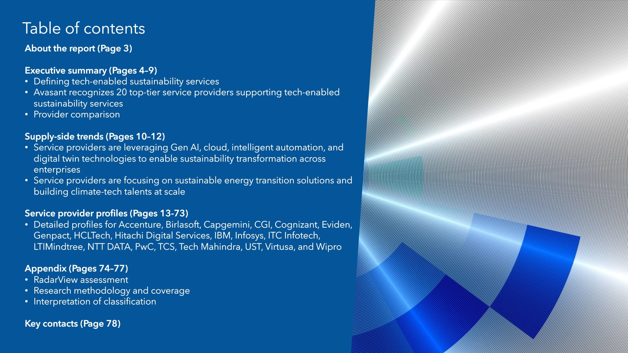 This RadarView helps enterprises craft a robust strategy based on industry outlook, best practices, and digital transformation in the tech-enabled sustainability services domain. It begins with a summary of key trends shaping the supply side of the market. It continues with a detailed assessment of 20 providers offering digital services in tech-enabled sustainability services. Each profile gives an overview of the service provider, its industry-specific solutions, and a list of representative clients and partnerships, along with brief client case studies. Each profile concludes with analyst insights on the provider’s practice maturity, investments and innovation, and partner ecosystem.