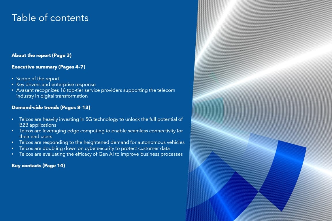 This report identifies key demand-side trends in the telecom industry that can help enterprises fine-tune their digital strategies. It also provides an overview of enterprise challenges in the telecom industry based on Avasant’s assessment.