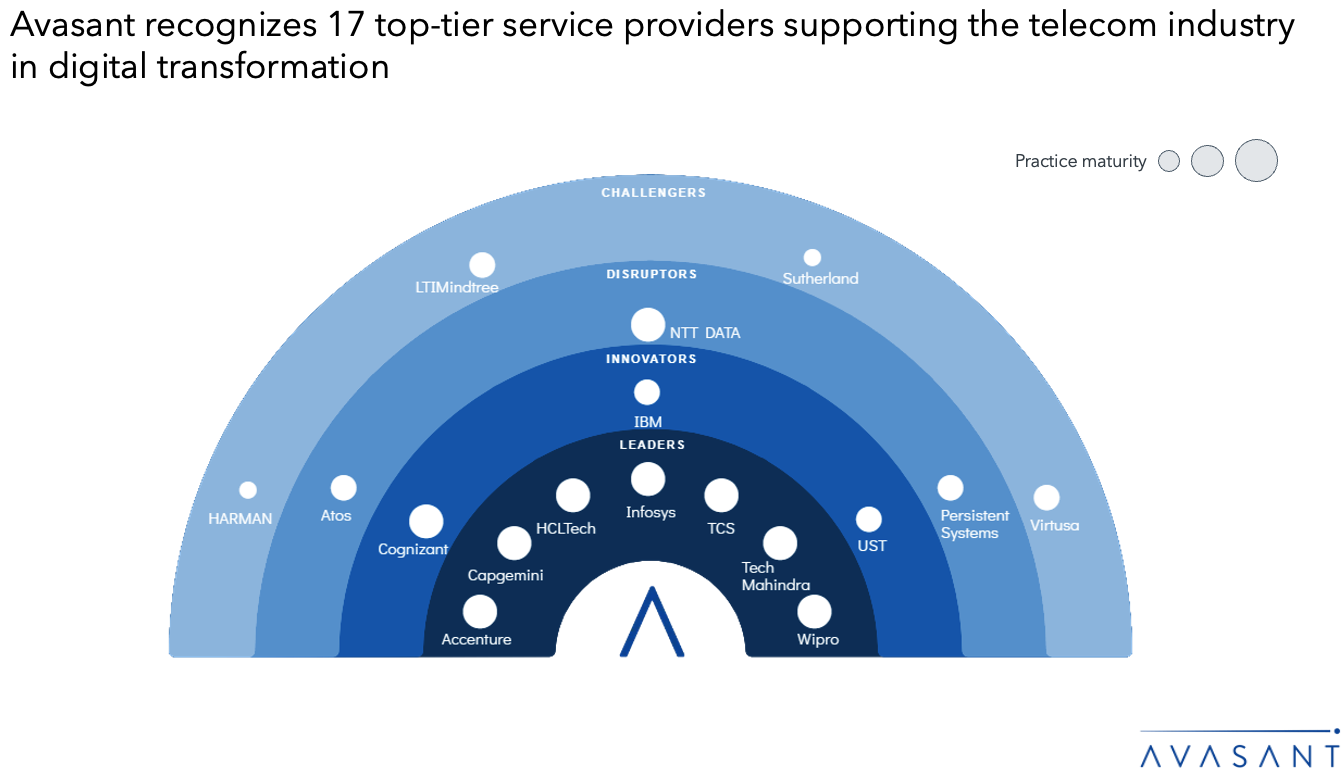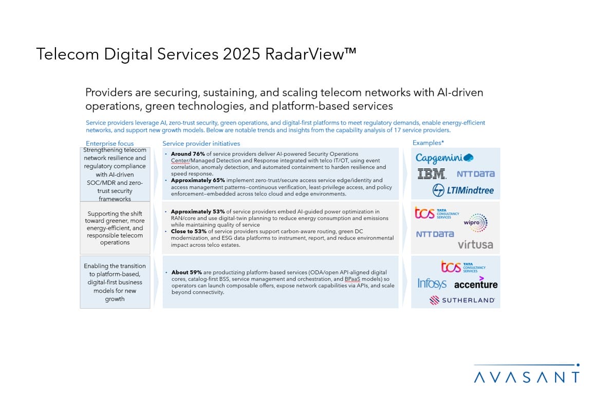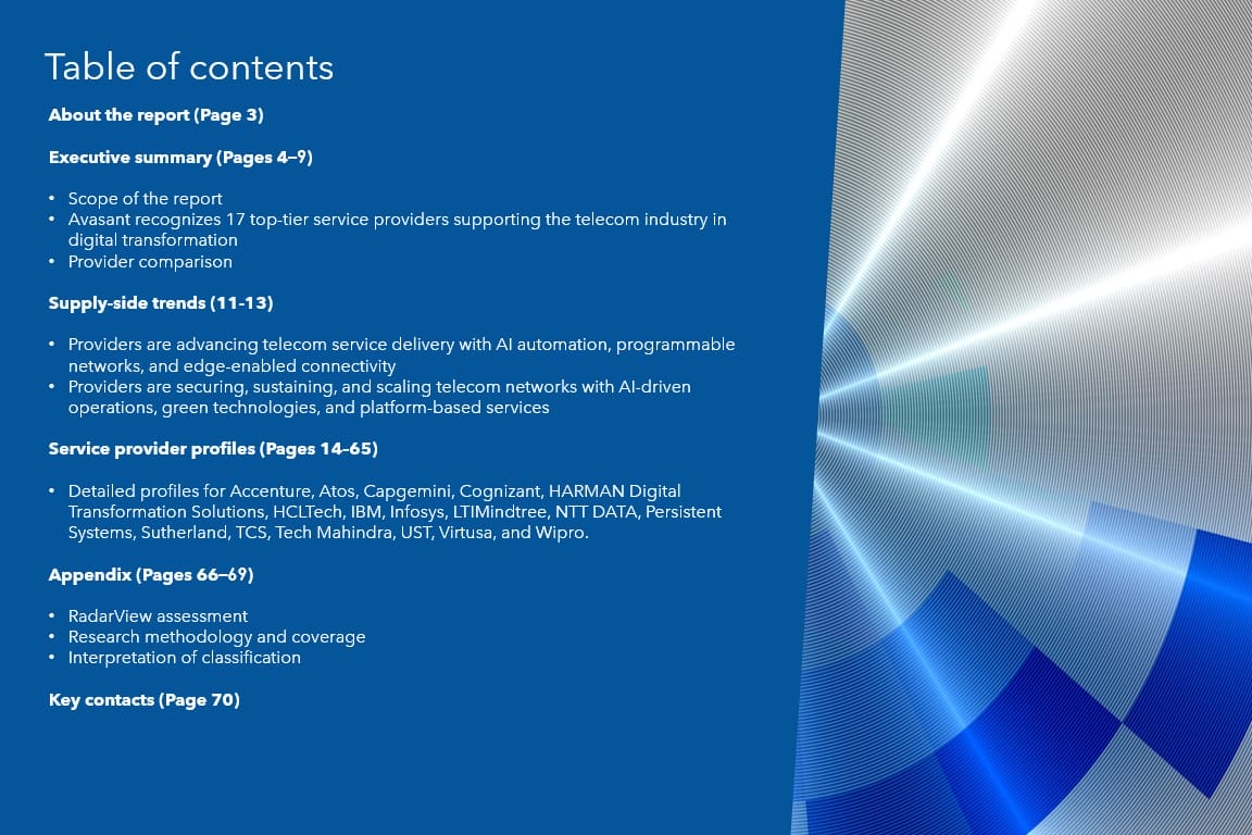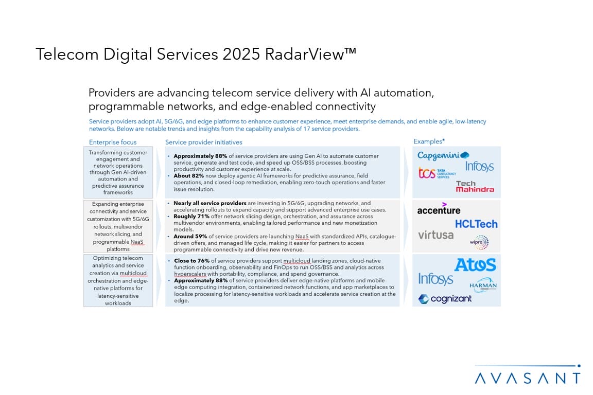 The Telecom Digital Services 2025 RadarView™ highlights key supply-side trends in the telecom space and Avasant’s viewpoint on them. It aids telecom companies in identifying top service providers to assist them in the digital transformation of their services. It also analyzes each service provider’s capabilities in technology and delivery support, enabling organizations to select the right strategic partners for the telecom industry.