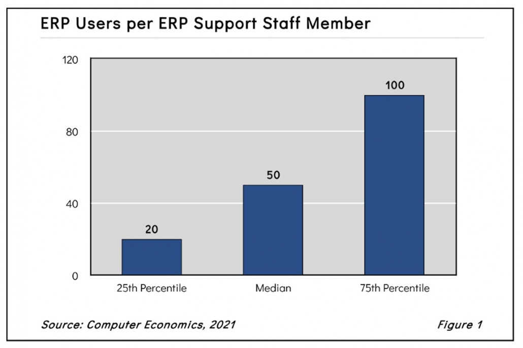 Figure 1 from our full report, ERP Support Staffing Ratios, shows the typical range of ERP support staffing ratios for installations of all sizes and types. At the median, there are 50 users per ERP support specialist, rising to 100 users per ERP specialist at the 75th percentile and falling to 20 users at the 25th percentile.