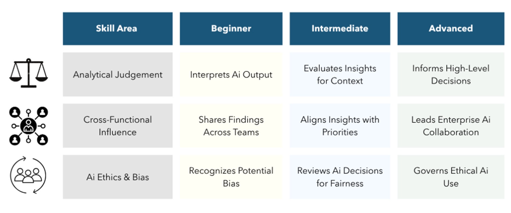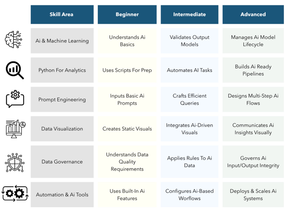 The skills matrix below outlines this dual path forward. On the technical side, analysts are expected to become fluent in AI tools, automation platforms, and programming languages like Python. But equally important are the strategic capabilities: critical thinking, business acumen, ethical awareness, and the ability to communicate insights effectively.