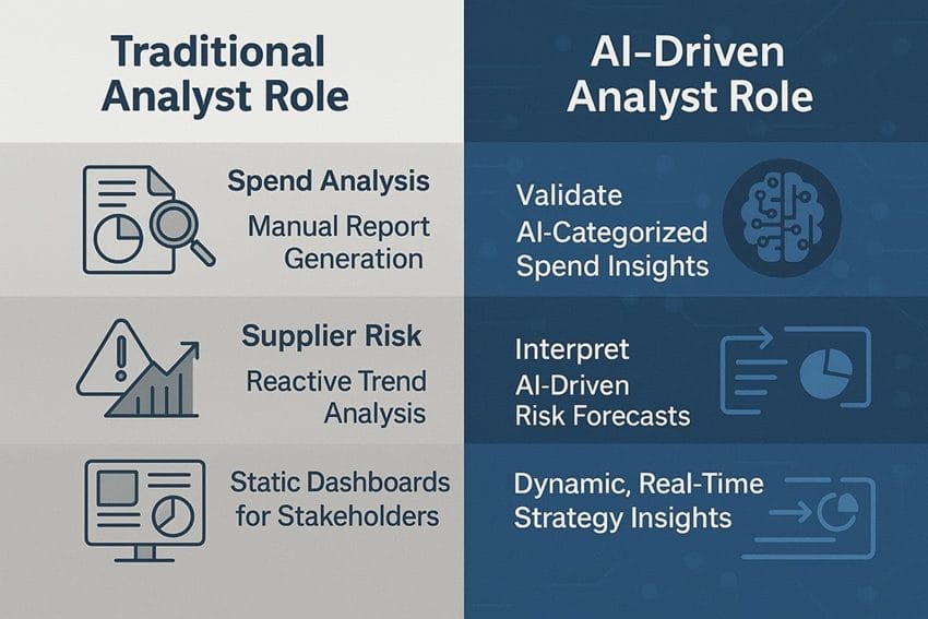 analysts focused on descriptive tasks—generating spend reports, tracking supplier performance, and summarizing trends. These tasks were manual and repetitive. AI has shifted the focus to foresight, automating routine analytics and elevating analysts to strategic roles like supervising AI models and managing risks.