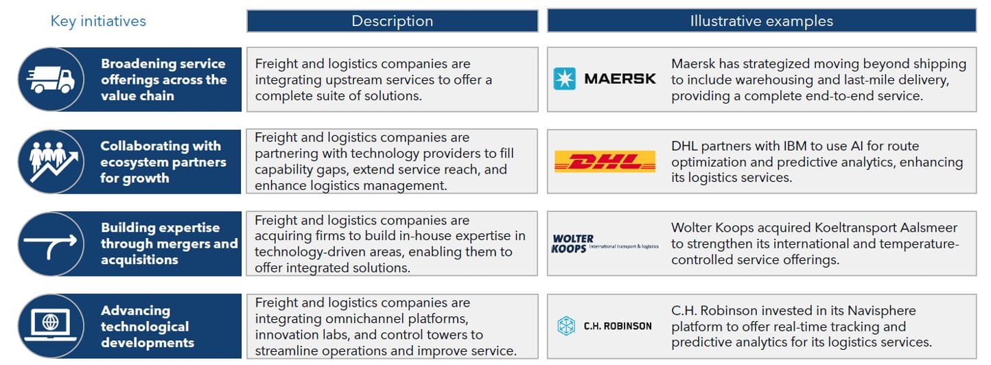 As the freight and logistics industry evolves, companies are increasingly adopting innovative strategies and technologies to enhance their service offerings and maintain a competitive edge. According to our Freight and Logistics Digital Services 2024 Market Insights™ report, logistics providers are focusing on a multifaceted approach to fuel growth and deliver greater value to customers.