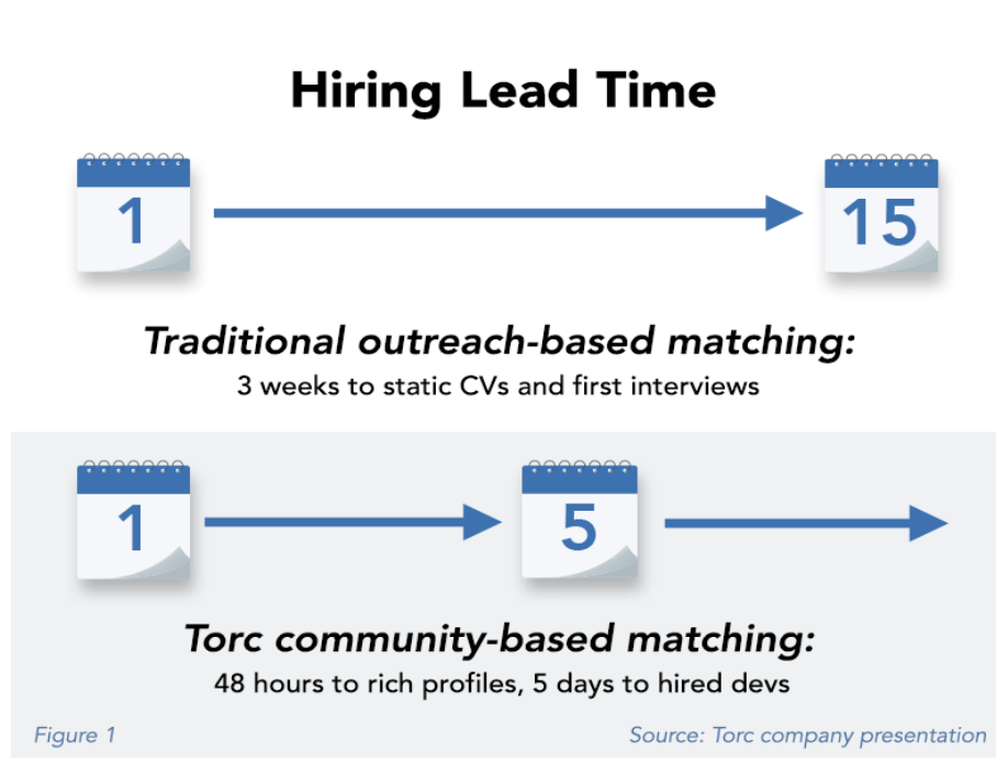 The quality that sets Torc apart from other talent marketplaces is how it is focused heavily on serving its developers, including providing productivity and developer experience tools and mentorship. As shown in Figure 1, Torc’s community-based matching—48 hours to rich profiles, five days to hired developers—far surpasses the traditional outreach-based matching, with its slow slog from static CVs to first interviews.