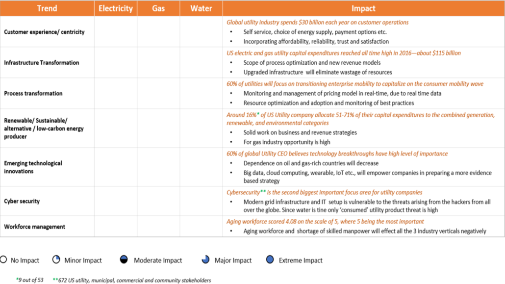 Utility companies are increasing infrastructure spending to update, maintain, repair and expand power lines, pipes and power plants. According to The Electric Power Research Institute (EPRI) infrastructure investments, in the US alone, are estimated to be between $17 – $24 billion yearly through 2030 to fully deploy smart grid technologies. IT organizations will have to transform not only to adjust to the new technology model but the operational model to become more agile as the rapid technology advancements continue to occur. This change in culture will require utilities to make the move to agile delivery models and build strong, smart innovative cultures. This will allow utilities to develop the ability to rapidly bring new products to market, and new ways of delivering services and connecting with customers in a sustainable and strategic way. These changes will not be incremental but quantum/breakthrough step-changes so this will be a major culture change for most utilities since historically most utilities are conservative and not fast to adapt to change. Along with the change in culture to become more adaptive to the market and customer requirements, utilities are having to become more conscious of the ever-increasing threat to their infrastructure grids. As utilities are digitizing their grids and infrastructures, cyber risk will increase. Utilities and their partners are going to be forced to continually adapt and increase their investments in advanced cyber securities solutions. Electric, gas and water utilities are all facing these challenges and more to a varying degree.