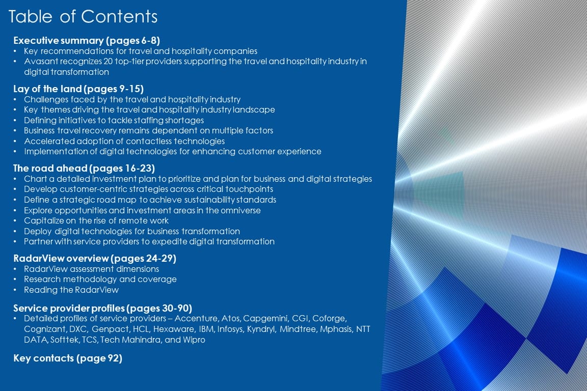 This RadarView includes an analysis of the following service providers in the travel and hospitality digital services space: Accenture, Atos, Capgemini, CGI, Coforge, Cognizant, DXC, Genpact, HCL, Hexaware, IBM, Infosys, Kyndryl, Mindtree, Mphasis, NTT DATA, Softtek, TCS, Tech Mahindra, and Wipro.