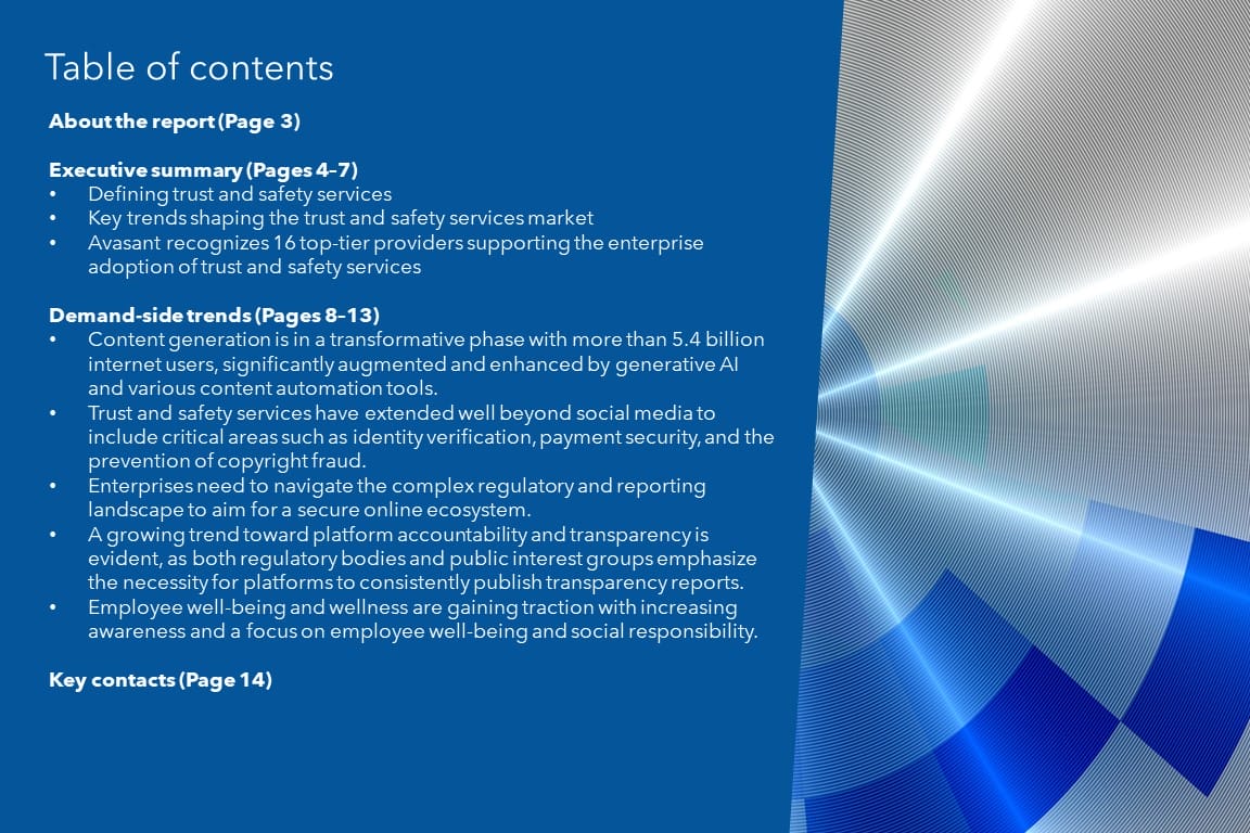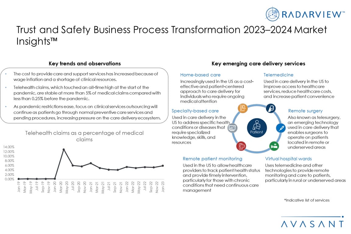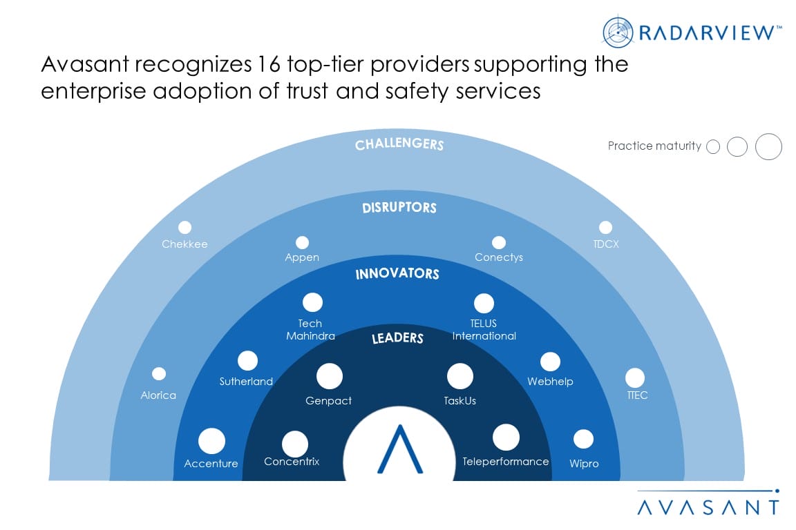 Please refer to Avasant’s Trust and Safety Business Process Transformation 2023–2024 RadarView™ for detailed insights on the service providers and supply-side trends.