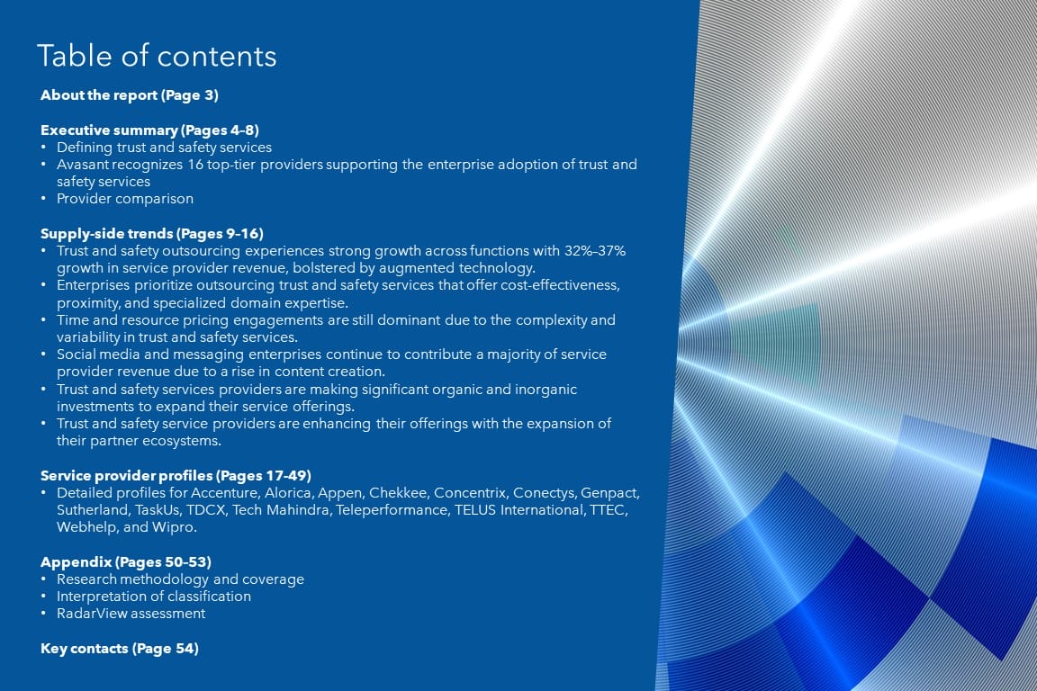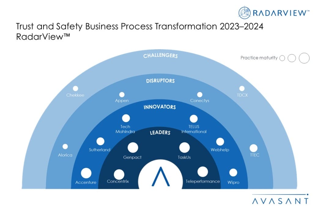 The Trust and Safety Business Process Transformation 2023–2024 RadarView™ highlights key supply-side trends in the trust and safety space and Avasant’s viewpoint on them. It aids companies in identifying top service providers to assist them in outsourcing trust and safety services. It also analyzes each service provider’s technology and delivery support capabilities, enabling organizations to identify the right strategic partners for trust and safety services.